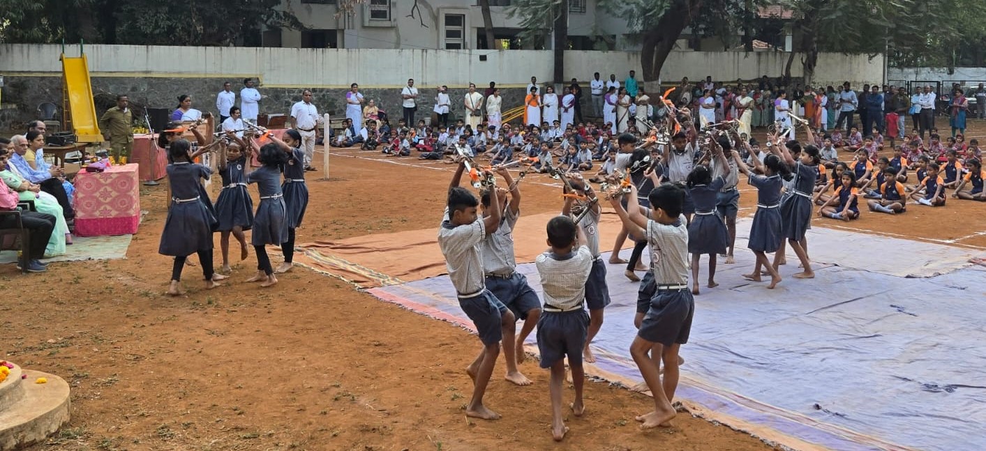 शाळेतील विद्यार्थ्यांनी साधन कवायत, सूर्यनमस्कार, लेझीम अशी प्रात्यक्षिके सादर केली. देशभक्तीपर कवितांचे वाचन, समूहगीत सादर केले. शिशुशाळेतील विद्यार्थ्यांनी विविध व्यावसायिकांच्या भूमिकेचे सादरीकरण केले.